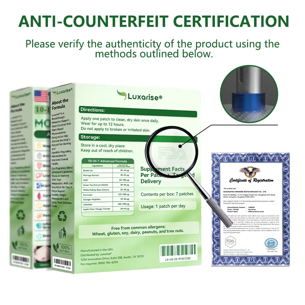 โWe are a professional team with extensive clinical and research experience in the field of endocrinology, and many of our members have personally experienced obesity and its related complications. We have also tried a wide range of common weight-loss products available on the market, often with very limited results. These firsthand experiences motivated us to develop a solution for metabolic health and weight management that is safe, natural, and truly effective. After 12 years of continuous research, our team first conducted self-testing and successfully broke through the limitations of traditional single-pathway ๐ด๐๐๐๐๐๐ mechanisms. By utilizing a dual-pathway ๐ด๐๐๐๐๐๐ย approach, we achieved significant improvements in weight reduction and metabolic health, with no rebound effects and no adverse reactions. We then conducted large-scale studies and clinical trials involving more than 5,000 participants, which further validated the performance of Luxariseยฎ Moringa & Berberine 10-IN-1 Advanced Nano Microneedle Patch in metabolic regulation, appetite control, and overall wellnessโshowing especially strong results among adults over 40 with overweight or obesity. Supported by contemporary medical research, Luxariseยฎ Moringa & Berberine 10-IN-1 Advanced Nano Microneedle Patch has passed the FDAโs rigorous regulatory review and certification, with its safety, effectiveness, and compliance formally recognized. It represents a scientific advancement beyond traditional ๐ด๐๐๐๐๐๐ solutions, offering a natural, safe, and effective option for individuals seeking comprehensive metabolic support and long-term weight management.โ