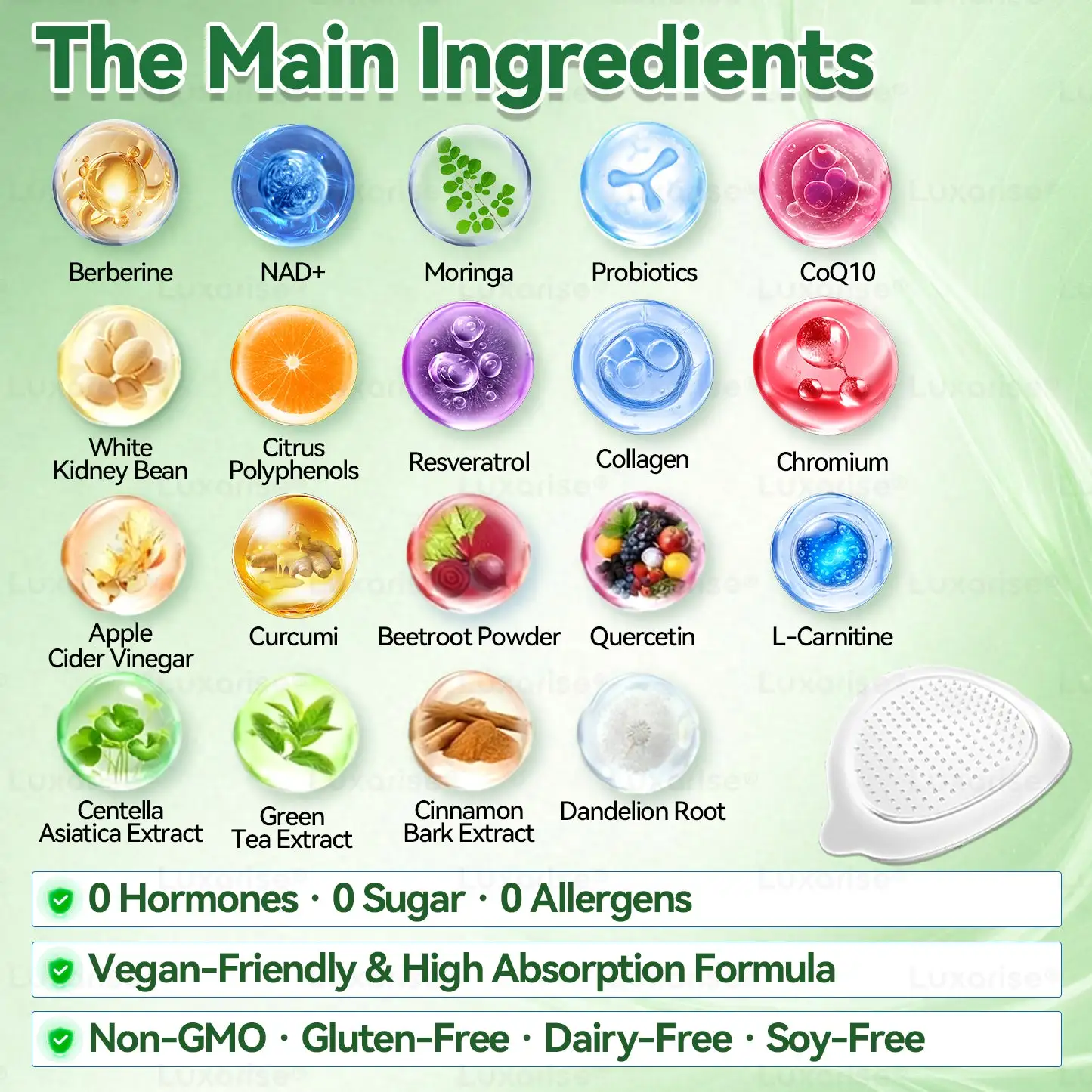 โค๏ธ Green Tea Extract๏ผRich in antioxidants such as catechins, particularly EGCG (epigallocatechin gallate). It possesses potent antioxidant and anti-inflammatory properties, promoting fat burning, boosting metabolism, supporting cardiovascular health, enhancing brain function, and exhibiting potential anti-cancer effects.