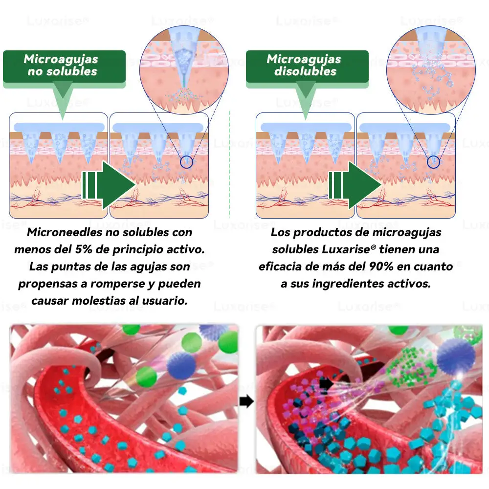 Nuestro parche de nanomicroagujas estรก dermatolรณgicamente probado y diseรฑado con precisiรณn para controlar la liberaciรณn transdรฉrmica de ingredientes activos.ย Si bien la piel actรบa naturalmente como una barrera protectora, este avanzado sistema de nanomicroagujas estรก especรญficamente diseรฑado para penetrar dicha barrera de forma segura y eficaz. Cada microaguja mide tan soloย 0,27 mm de longitud (aproximadamente una sรฉptima parte del grosor de un cabello humano) y estรก hecha de materiales bioactivos solublesย , lo que garantiza unaย aplicaciรณn suave y prรกcticamente indolora,ย a la vez que libera los ingredientes directamente en la piel.