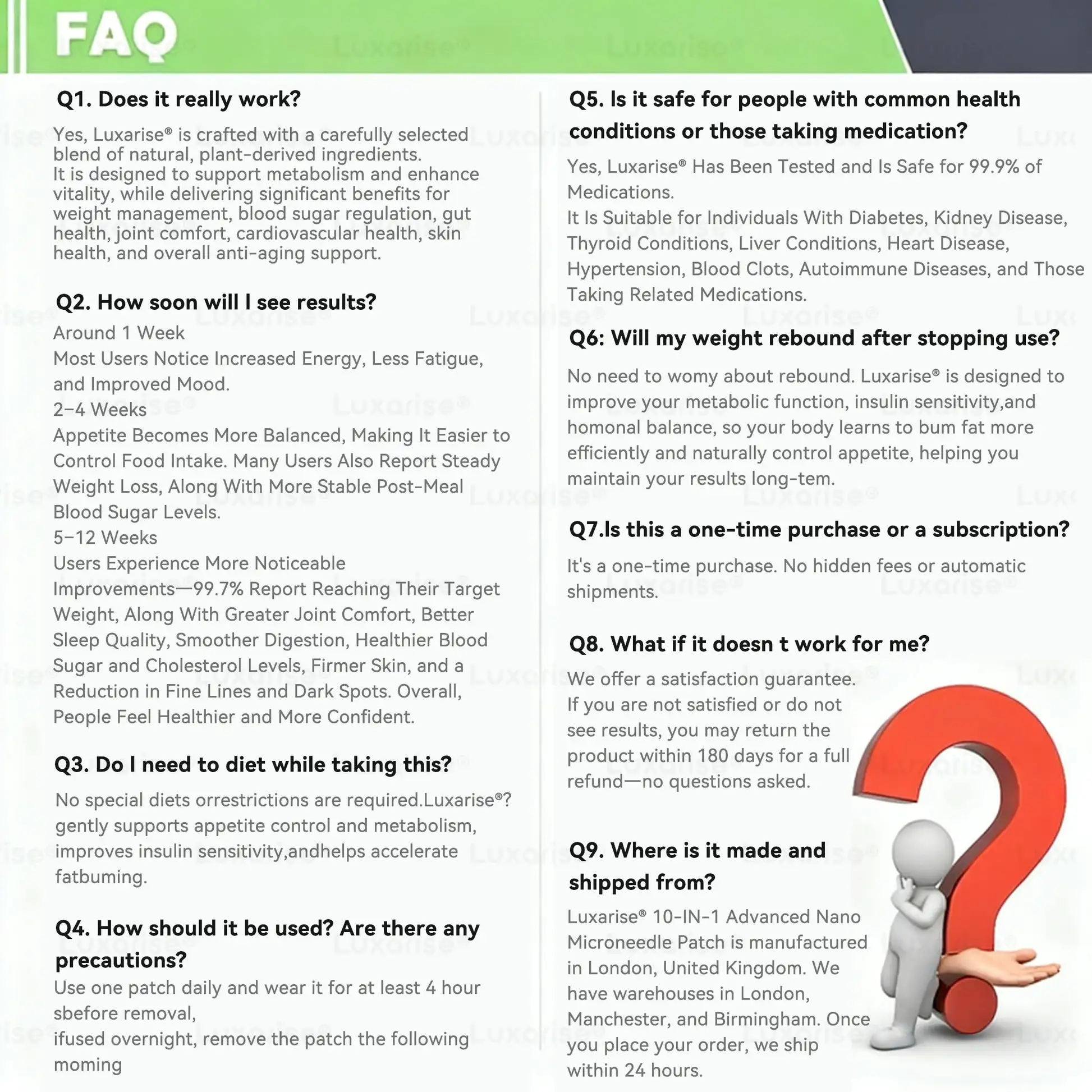 This 100% natural, scientifically formulated patch is designed so that all active ingredients work synergistically without interference. Because it bypasses the digestive system, it can be safely used alongside daily meals and routine products. The patch is vegan-friendly, offers high transdermal absorption, and contains no hormones, sugars, or allergenic ingredients. It is non-GMO, gluten-free, soy-free, and free from artificial colors, fragrances, and preservatives.